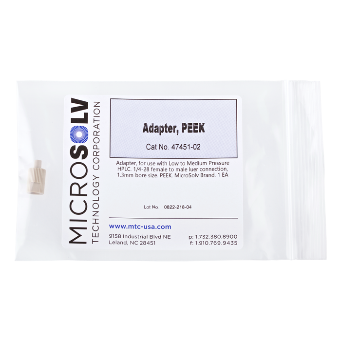 Adapter, for use with low to medium pressure HPLC. 1/4-28 female to male luer connection, 1.3 mm / 0.051 bore size. PEEK. ARE-Applied Research brand. Bulk Price.