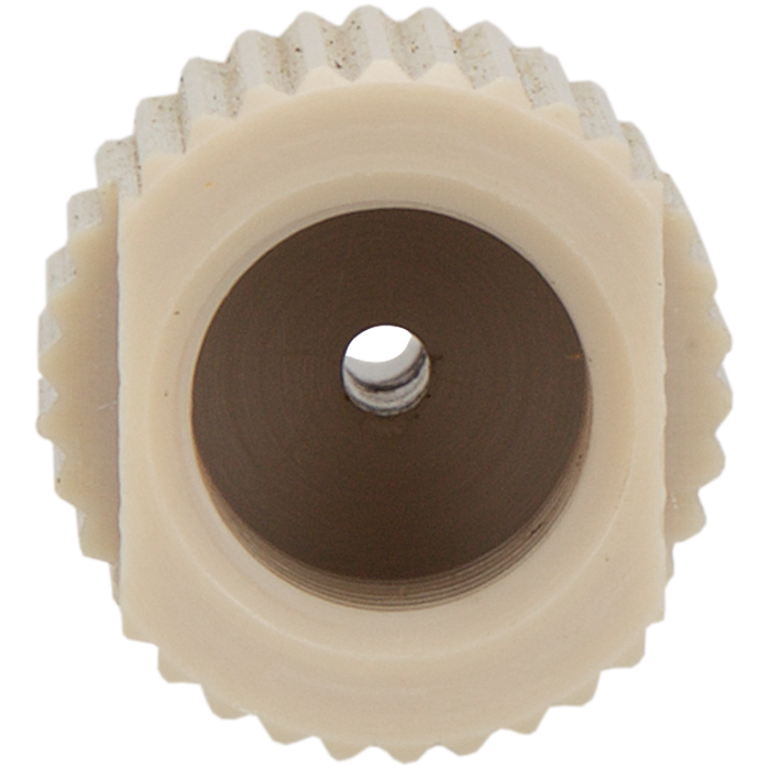 This wider bore, all-PEEK adapter has a 1/4-28 threaded female port on one side and a male Luer slip connector on the other.