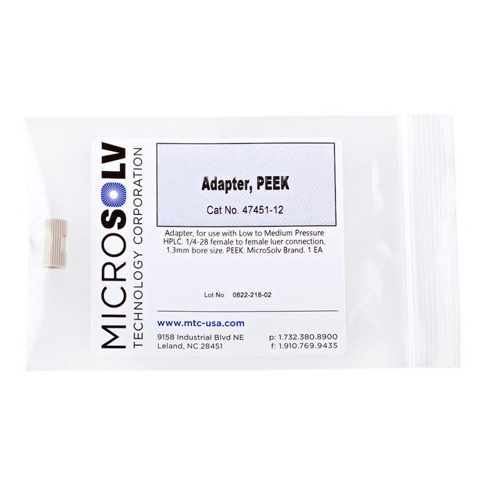 Adapter, for use with low to medium pressure HPLC. 1/4-28 female to female Luer connection, 1.3 mm / 0.051 bore size. PEEK. ARE-Applied Research brand. Bulk Price.