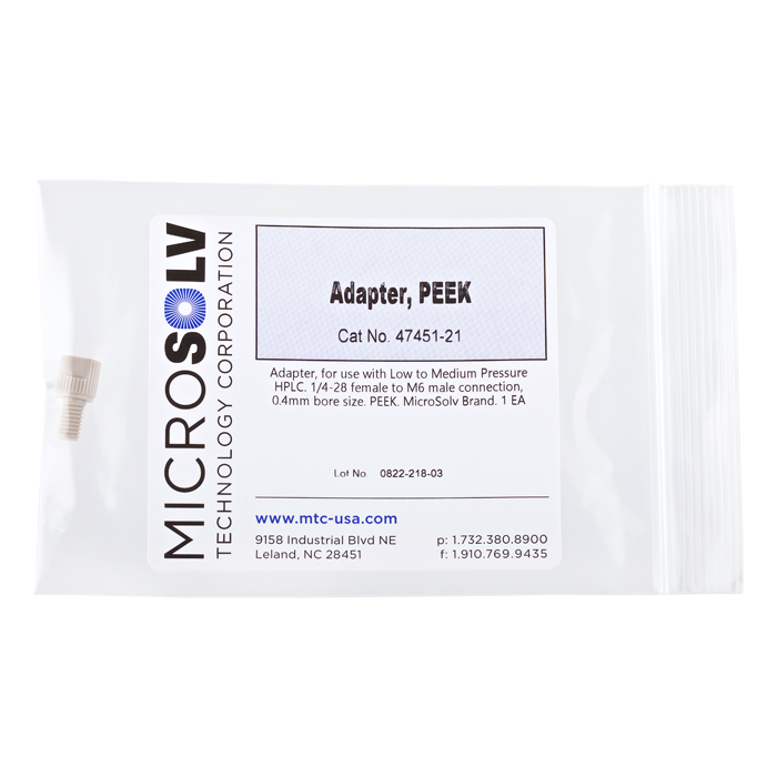 Adapter, for use with low to medium pressure HPLC. 1/4-28 female to M6 male connection, 0.40 mm / 0.016 bore size. PEEK. ARE-Applied Research brand. Bulk Price.