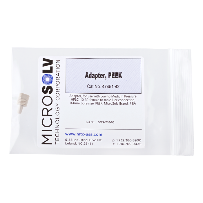 Adapter, for use with low to medium pressure HPLC. 10-32 female to male luer connection, 1.3 mm / 0.051 bore size. PEEK. ARE-Applied Research brand. Bulk Price.