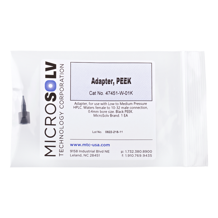 This finger tightened adapter makes changing from Waters® to more common connections very convenient. This all-PEEK adapter has a Waters® style female screw threaded port on one side and a standard 10-32 screw threaded male connector with a built-in ferrule with a "universal" pilot length.