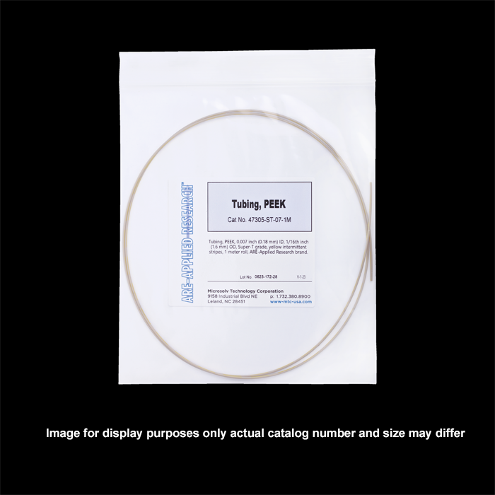 Tubing, PEEK, 0.007 inch (0.18 mm) ID, 1/16th inch (1.6 mm) OD, Ultra-T grade, yellow intermittent stripes, 10 meter roll, ARE-Applied Research brand. 1 EA.
