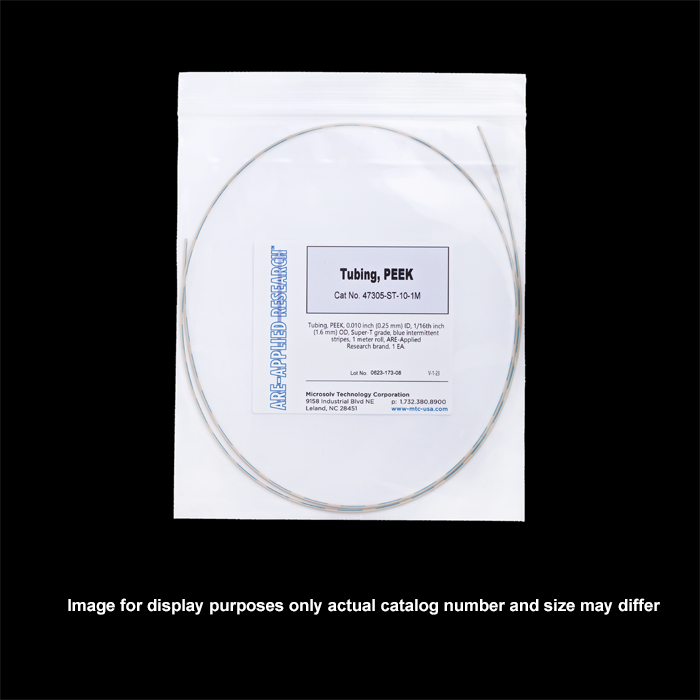 Tubing, PEEK, 0.010 inch (0.25 mm) ID, 1/16th inch (1.6 mm) OD, Ultra-T grade, blue intermittent stripes, 10 meter roll, ARE-Applied Research brand. 1 EA.
