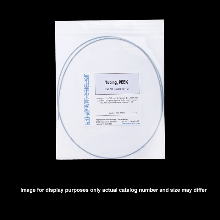 Tubing, PEEK, 0.010 inch (0.25 mm) ID, 1/16th inch (1.6 mm) OD, general grade, solid blue, 1 meter roll, ARE-Applied Research brand. 1 EA.