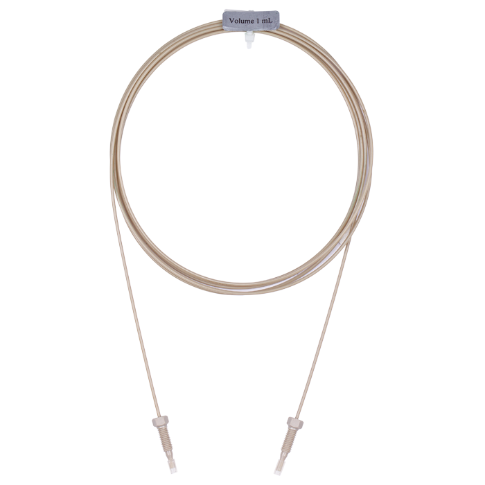 0.75 mm (+/- 0.025 mm) ID tubing is supplied with 2 high pressure, PEEK, three-piece, small hex head nuts with 1/32 inch threads and 2 special, single cone ferrules per nut to avoid twisting and turning of the sample loop. At the same time, the ferrules grip the tubing on two different places which increases the pressure stability of the connection. These fit the injectors and provide zero dead volume connections.