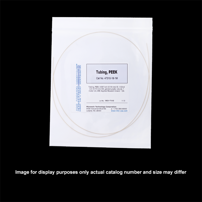 Tubing, PEEK, 0.007 inch (0.18 mm) ID, 1/32nd inch (0.79 mm) OD, general grade, natural, 10 meter roll, ARE-Applied Research brand. 1 EA.