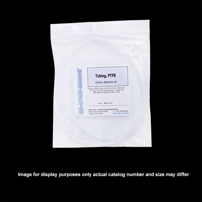 Tubing, PTFE, 0.19 inch (4.75 mm) ID, 1/4th inch (6.4 mm) inch OD, low pressure, Your continuous length tubing, priced per meter. ARE-Applied Research brand.