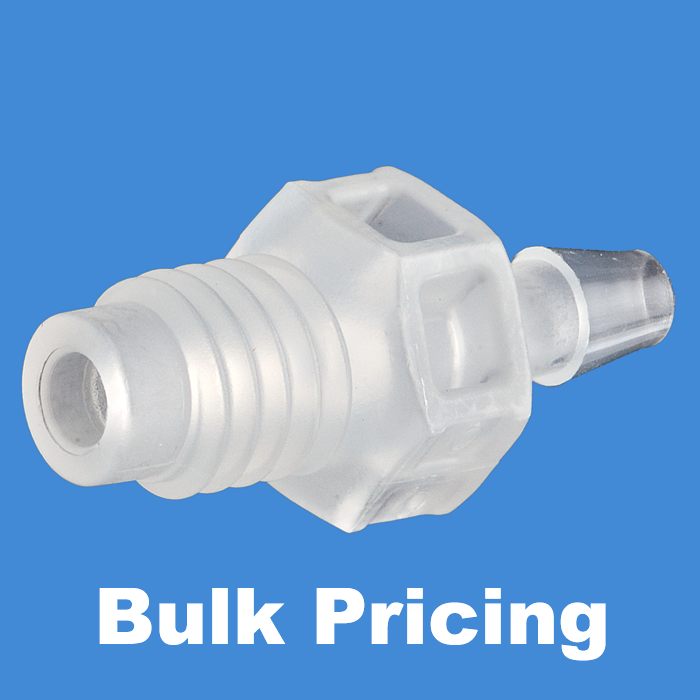 Adapter, for use with low pressure. Barbed connection for 3/32 inch tubing to M6 male connection. Polypropylene. ARE-Applied Research brand. Bulk Price.
