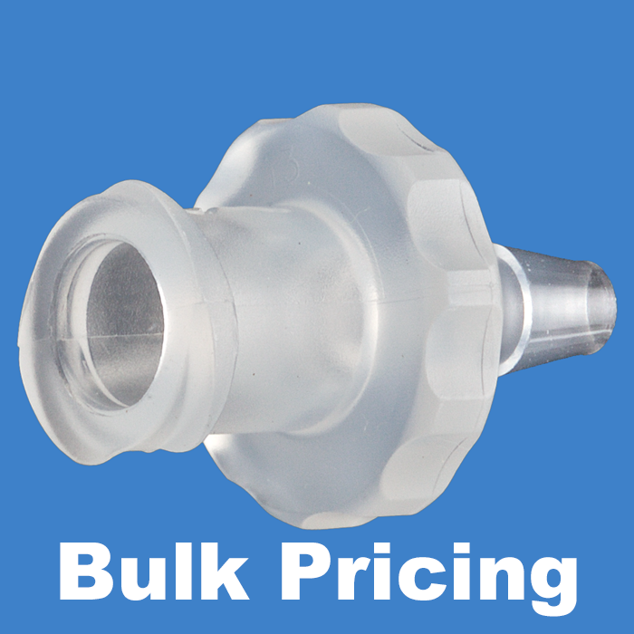 This adapter has a female Luer Lock port on one side and a hose barb connector for 3/32-inch (2.4 mm) ID tubing on the other side. Bulk packaging.