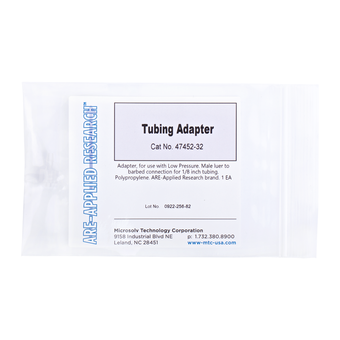 Adapter, for use with low pressure. Male luer to barbed connection for 1/8 inch tubing. Polypropylene. ARE-Applied Research brand. 10/PK.