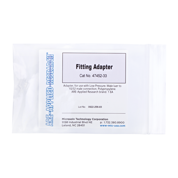 Adapter, for use with low pressure. Male luer to 10/32 male connection. Polypropylene. ARE-Applied Research brand. Bulk Price.