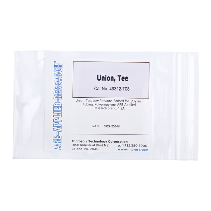 Union, Connector, Tee, low pressure, Barbed for 3/32 inch tubing. Polypropylene. ARE-Applied Research brand. 10/PK.