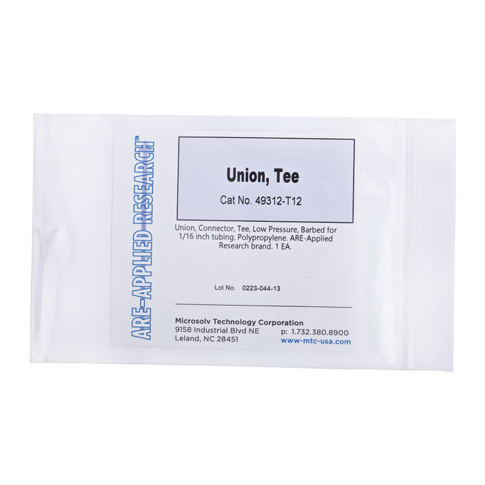 Union, Connector, Tee, low pressure, barbed for 1/16 inch tubing. Polypropylene. ARE-Applied Research brand. Bulk Price.