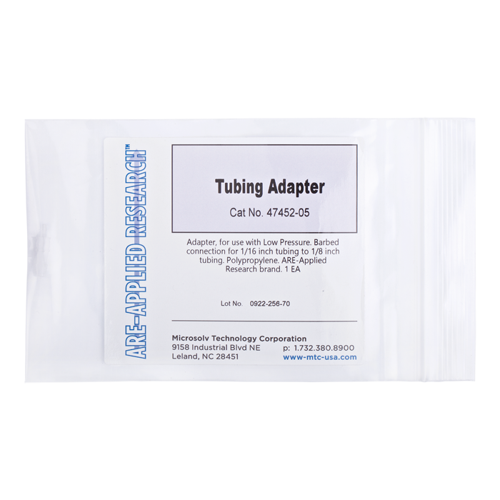 Adapter, for use with low pressure. Barbed connection for 1/16 inch tubing to 1/8 inch tubing. Polypropylene. ARE-Applied Research brand. 10/PK.