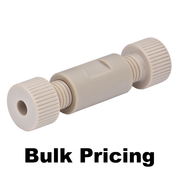 This all-PEEK set, of one union and two male nuts with 1/4-28 screw threads and matching ETFE ferrules with a standard pilot length, allows you to connect two pieces of low pressure, 1/16th OD tubing in a straight line.