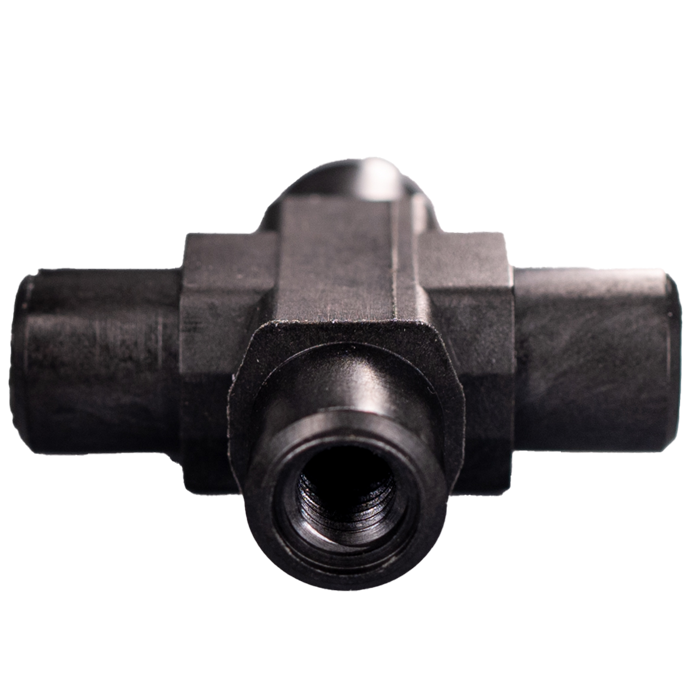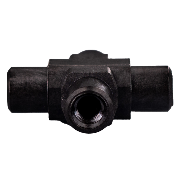 Union, connector, Cross, high pressure, 0.50 mm / 0.020 through hole with 10-32 screw threads. Carbon PEEK Endure. Use with 1/16 tubing. ARE-Applied Research brand. 10/PK.