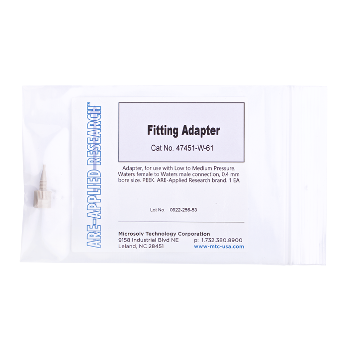 Adapter, for use with low to medium pressure HPLC. Waters female to Waters male connection, 0.40 mm / 0.016 bore size. PEEK. ARE-Applied Research brand. 5/PK.
