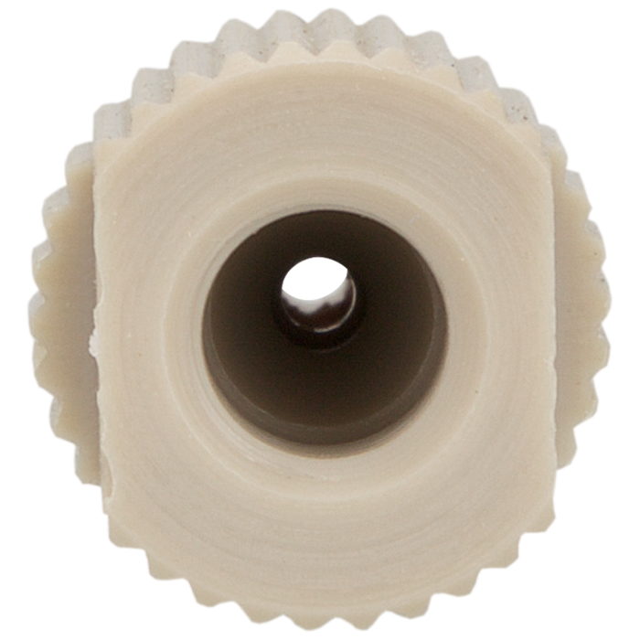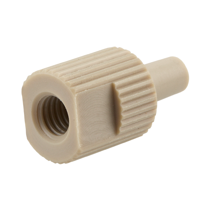 This wider bore, all-PEEK adapter has a 10-32 threaded female port on one side and a male Luer slip connector on the other side.