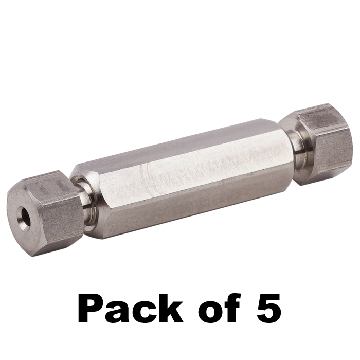 Union, Connector Kit, high pressure, 0.80 mm / 0.031 inch through hole with 10-32 mm screw threads. Stainless steel, straight line. Use with 1/16 inch tubing. ARE-Applied Research brand. 5/PK.