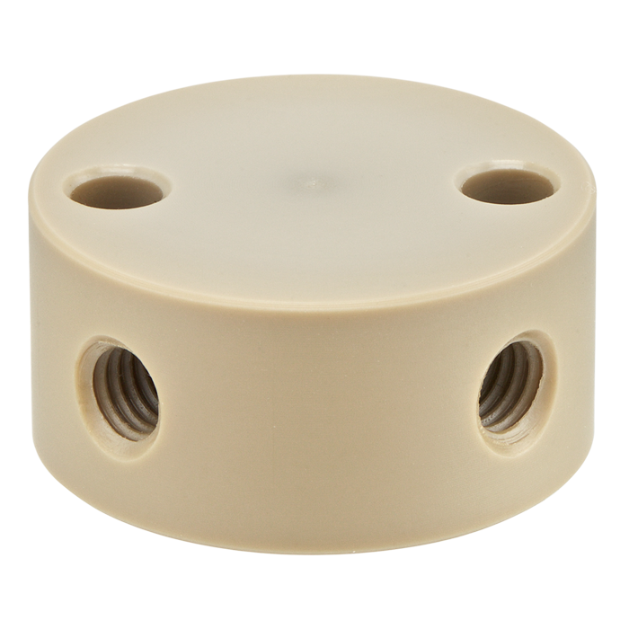 Union, Connector, Tee, low pressure, 0.75 mm / 0.030 inch through hole with 10-32 screw threads. PEEK, round with an internal "T". ARE-Applied Research brand. 10/PK.