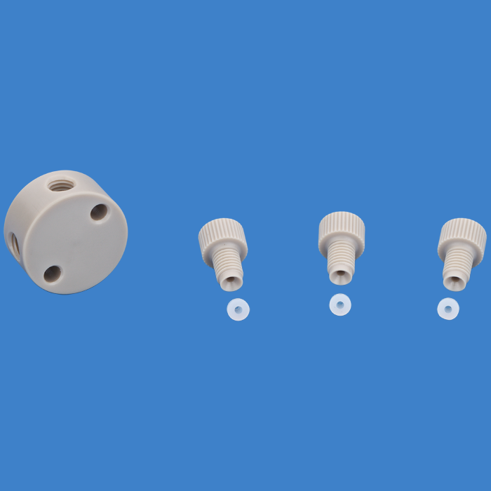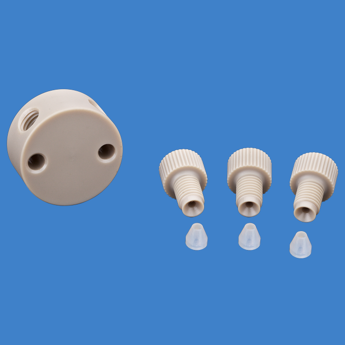 This all-PEEK set of one union and three finger tight fittings and 3 matching, polyethylene conical ferrules making a standard pilot length, allowing you to connect three pieces of low pressure, 1/16th tubing.