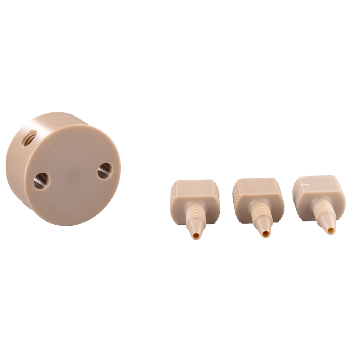 This "Union" set is used to connect PEEK or stainless steel tubing on all ends, in the high pressures zones of HPLC systems. A "Tee Connection" is often used to split flow into two directions or to combine two streams into one.