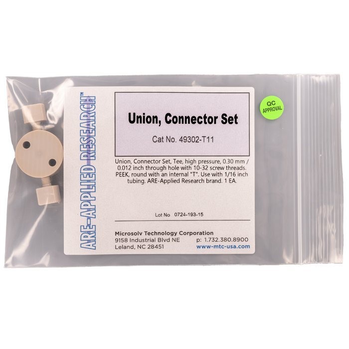 Union, Connector Set, Tee, high pressure, 0.30 mm / 0.012 inch through hole with 10-32 screw threads. PEEK, round with an internal "T". Use with 1/16 inch tubing. ARE-Applied Research brand. 5/PK.