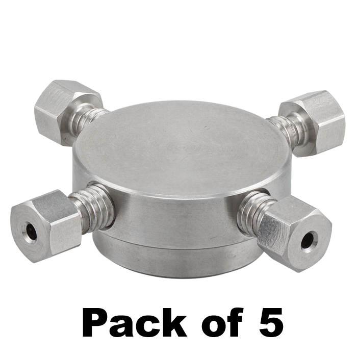 Union, Connector Kit, Cross, high pressure, 0.50 mm / 0.020 inch through hole with 10-32 screw threads. stainless steel, round with an internal "X" flow pattern. Use with 1/16 inch tubing. ARE-Applied Research brand. 5/PK.