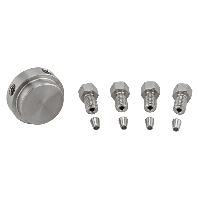 Union, Connector Kit, Cross, high pressure, 0.50 mm / 0.020 inch through hole with 10-32 screw threads. stainless steel, round with an internal "X" flow pattern. Use with 1/16 inch tubing. ARE-Applied Research brand. 10/PK.