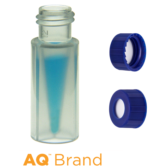 Vial & Cap Kit Includes 100 EA 300ul, Screw Top, Clear polypropylene LCMS Compatible Autosampler Vials and 100 EA matching Screw Caps with Silicone Rubber / Polypropylene Septa, bonded in the Blue Caps, AQ Brand Easy Purchase Pack. 1/PK.