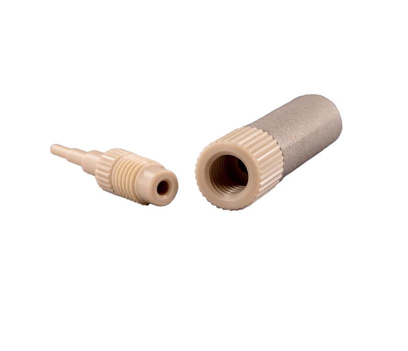 The All-PEEK tripod, 3 step molded connector, allows for inlet tubing from the mobile phase delivery system (pump) to easily slip over it making it usable with 1/16th inch (1.6 mm) and 1/8th inch (3.2 mm) ID, low pressure tubing. No ferrules or nuts are required.