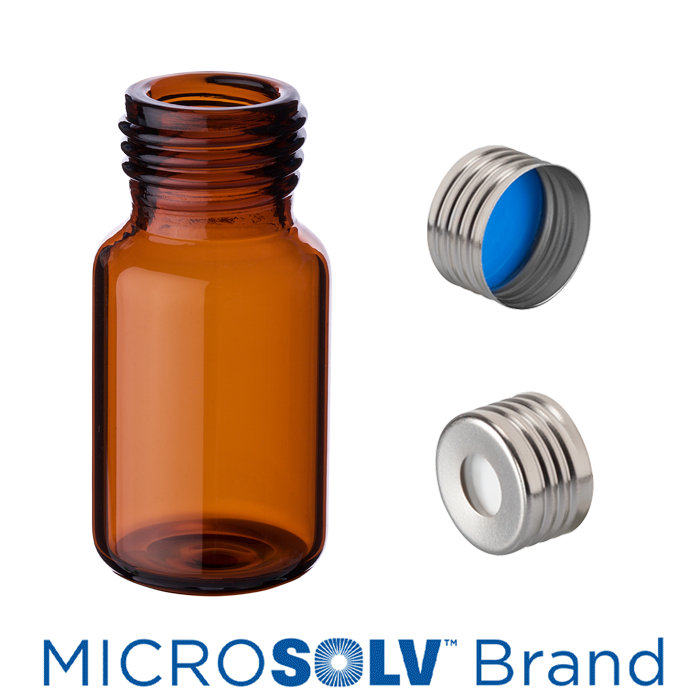 Vial & Cap Kit includes 1,000 EA 10 ml, screw top, Amber Headspace autosampler vials and 1,000 EA matching screw caps with White Silicone Rubber / Blue PTFE SPME Style Septa, fitted in Steel, Magnetic, Silver Caps. MICROSOLV Brand Easy Purchase Pack. 1/PK.