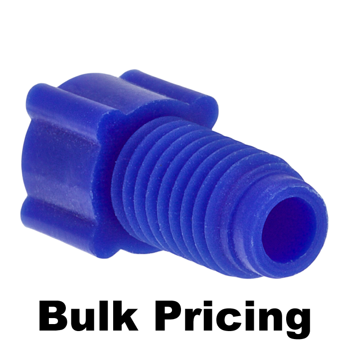 Tubing Connector Nuts, low pressure, 1/8 inch, Polypropylene, Blue with 1/4-28 screw threads, for use with flanged, polymeric tubing. ARE-Applied Research brand. Bulk Price.