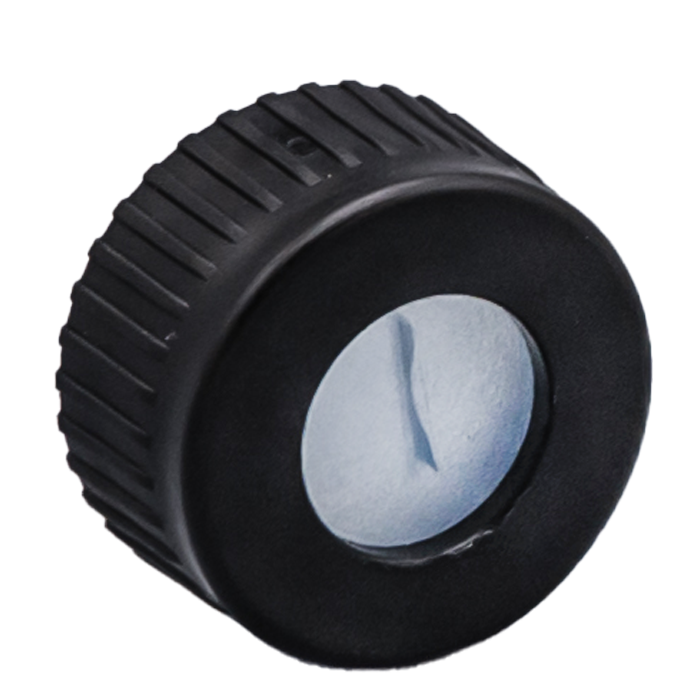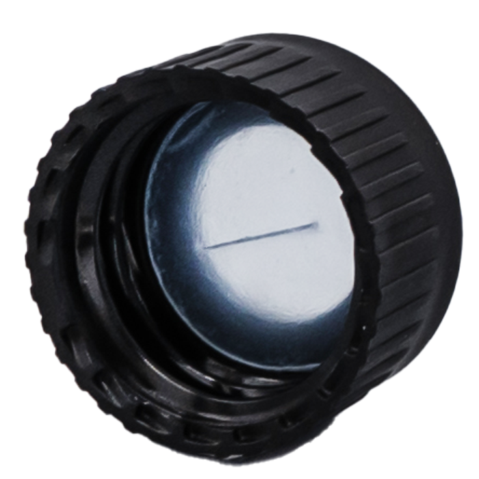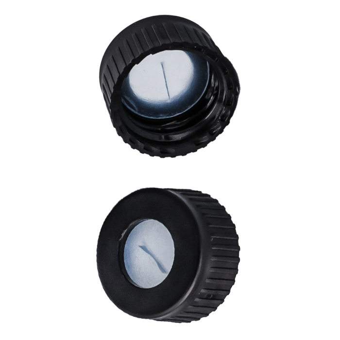 Caps, Screw Top, with translucent Silicone / clear Polypropylene, pre-slit, Septa, bonded in knurled, polypropylene, Black caps. For use with 9-425mm thread, 12x32mm autosampler vials. MICROSOLV Brand. 1,000/CS.