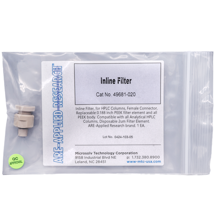 Inline Filter, for HPLC, female connection, replaceable 0.188 inch PEEK filter elements and All-PEEK body. Includes 10 disposable 2 um PEEK filters. ARE-Applied Research brand. Bulk Price.