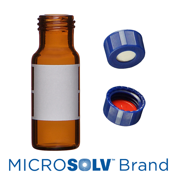 Vial & Cap Kit Includes 100 EA 2ml, Screw Top, Amber Autosampler Vials with Write on Patch and fill lines and 100 EA matching Screw Caps with White Silicone Rubber / Red PTFE Pre-Slit, Soft-Guard Septa, bonded in the Blue Caps. MICROSOLV Brand Easy Purchase Pack. 1/PK.