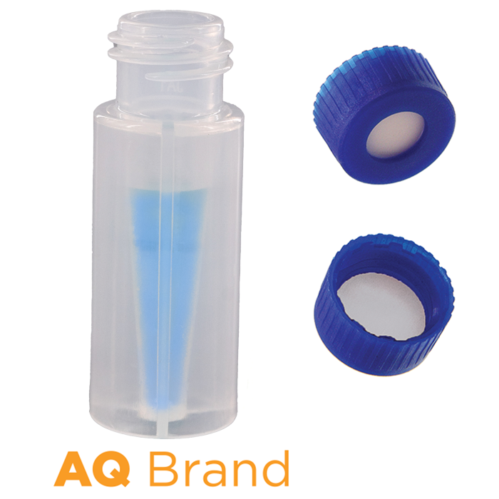 Vial & Cap Kit Includes 100 EA 300ul, Screw Top, Clear polypropylene LCMS Compatible Autosampler Vials with a marking spot and 100 EA matching Screw Caps with White Silicone Rubber / Tan PTFE Septa bonded in the Blue Caps. AQ Brand Easy Purchase Pack. 1/PK.